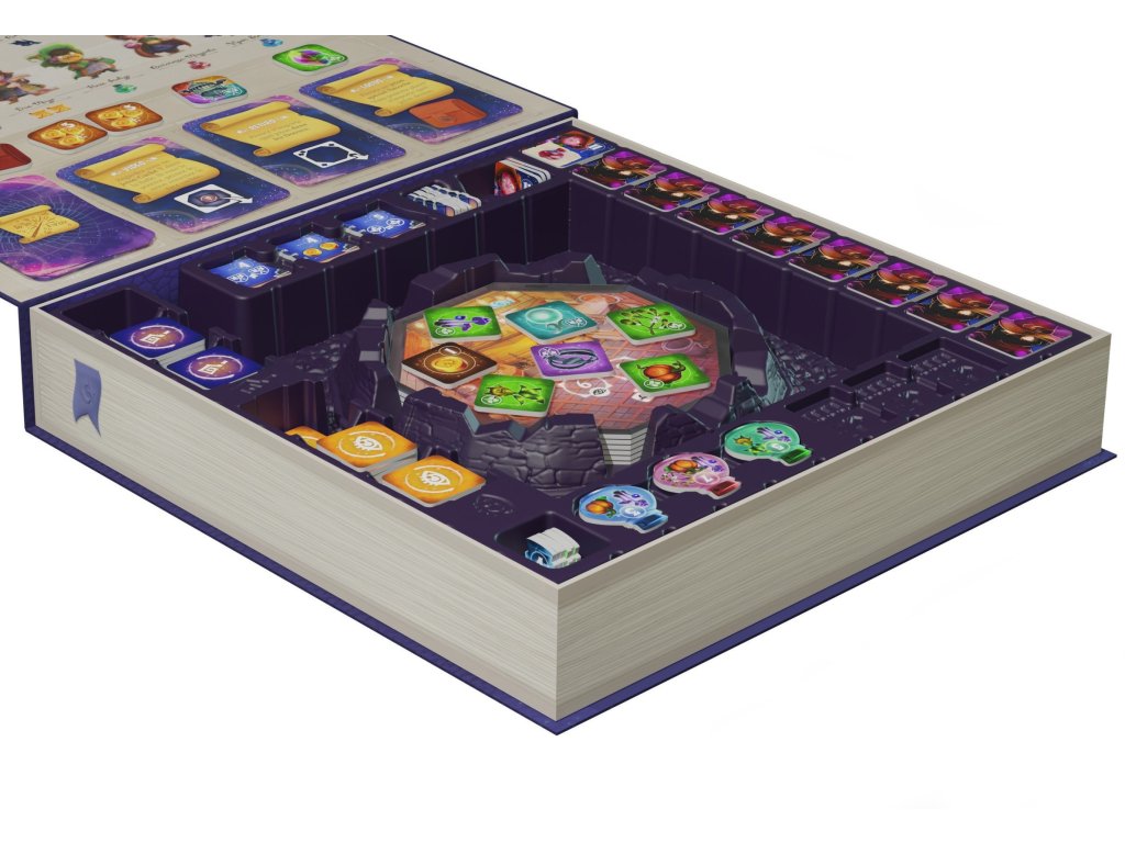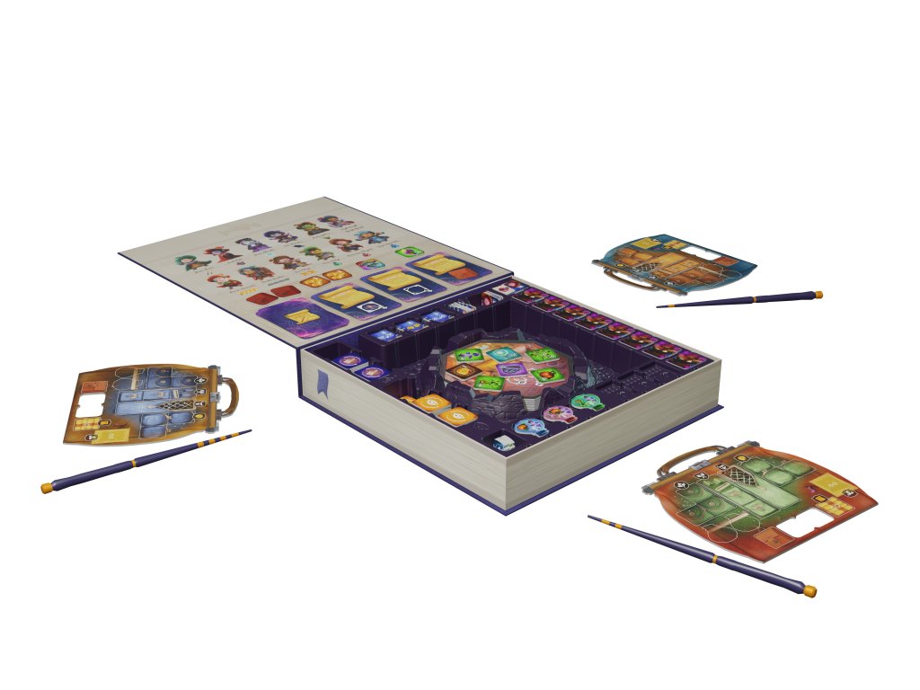 Hra prichádza v unikátnej krabici v tvare knihy, ktorá zároveň slúži ako herný plán s vežou a vodnou priekopou. Obsahuje desiatky žetónov, kariet kúziel, kúzelné paličky rôznych síl a obojstranné kufre pre základný aj expertný režim. Vďaka variabilnej príprave a náhodnému rozloženiu miestností je každá hra iná.