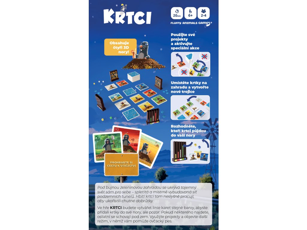 V hre Krtkovia budete vytvárať línie troch kariet (vodorovne, zvisle alebo diagonálne) a tak pridávať krtkov do svojej nory. Nezabudnite tiež využívať nové projekty na vykonávanie špeciálnych akcií. Ale pozor! Samotné hromadenie krtkov na výhru nestačí. Naozajstnou výzvou je správne rozloženie síl. Na konci hry totiž získate body tak, že vynásobíte počet kociek svojej najpočetnejšej farby počtom kociek svojej najmenej početnej farby!