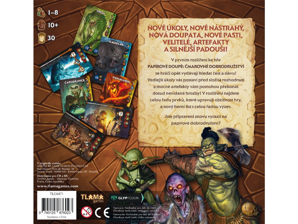 V prvom rozšírení k hre PAPÍROVÉ DOUPĚ: ČMAROVNÉ DOBRODRUŽSTVÍ sa hráči opäť stanú vodcami štvorčlennej družiny tradičných hrdinov z fantasy príbehov a povedú ju v ústrety novým výzvam. Nový brloh je ešte nebezpečnejší ako to predchádzajúce a je plný hrozivých netvorov a tajných nástrah. Navyše môžete plniť aj vedľajšie úlohy, za ktoré získate slávu či mocné artefakty. Na konci ôsmeho kola sa hráč s najväčšou slávou stane víťazom!